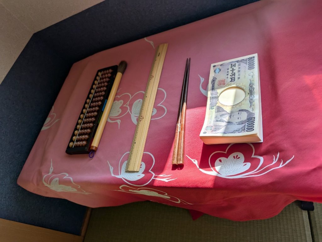 そろばん、筆、定規、はし、お金の5種類から選び取りします。わが子は迷うことなく筆を手に取り、皆に見えるように堂々と掲げていました。