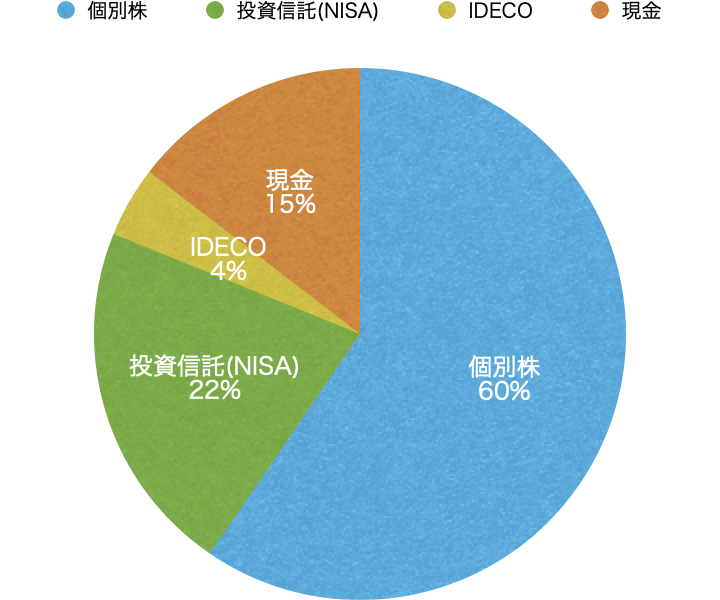 個別株が60%、投資信託が22%、IDECOが4%、現金が15%でした。