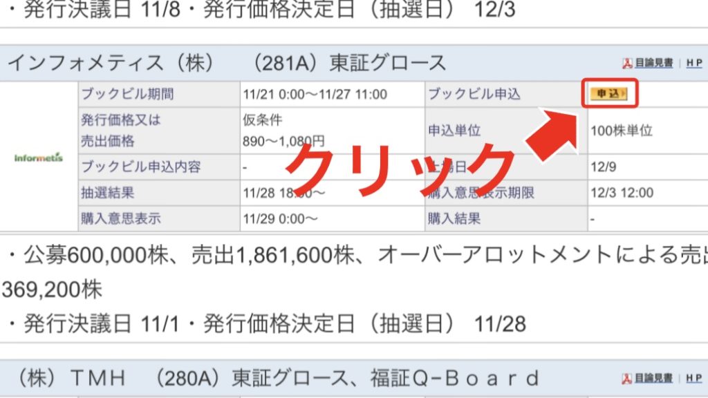 2 抽選に申込みしたい銘柄を見つけたら、「申込」をクリック