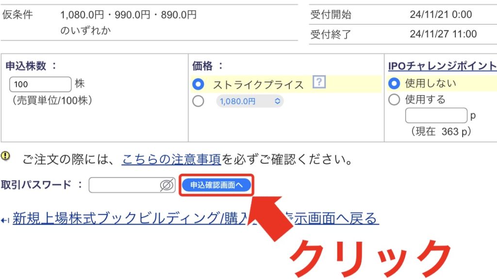 3 「申込株数」「価格」「IPOチャレンジポイント」を入力。