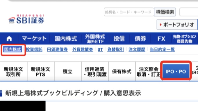 1 SBI証券にログインし、「国内株式」→「IPO・PO」をクリックします。